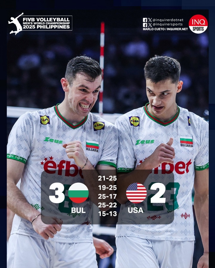 直播吧09月25日讯 2025男排世锦赛1/4决赛,世界排名第4的美国男排对阵世界排名第11的保加利亚男排。最终经过5局鏖战,保加利亚男排3-2完成惊天逆转,挺进世锦赛四强。