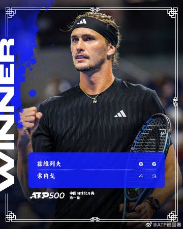 直播吧9月26日讯 中网男单首轮,兹维列夫2-0轻取索内戈晋级。