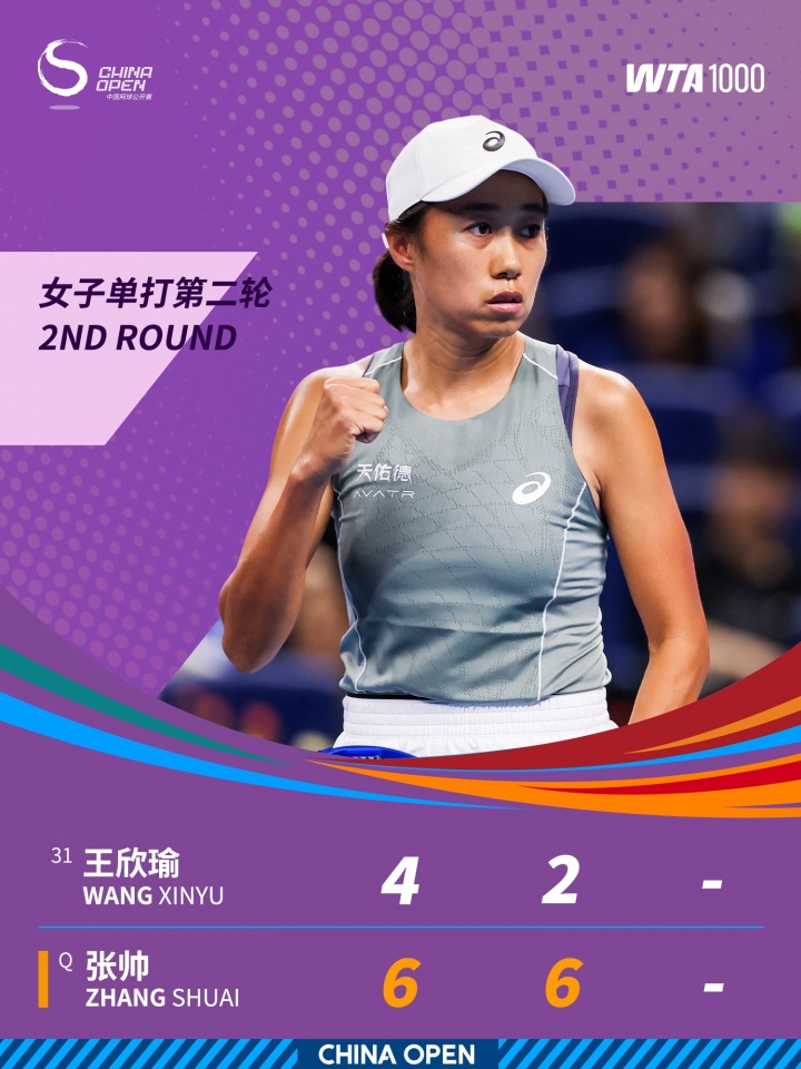 直播吧09月26日讯 2025中网女单第2轮,36岁老将张帅2-0战胜31号种子王欣瑜,晋级中网女单32强,张帅第三轮将战3号种子阿尼西莫娃。