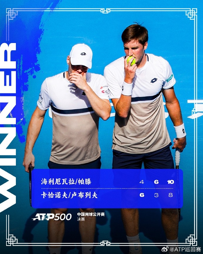 直播吧10月1日讯 中网男双决赛,两届大满贯冠军组合海利厄瓦拉/帕滕以4-6 6-3 10-8逆转卡恰诺夫/卢布列夫,夺得两人合作以来的男双第6冠。这是海利厄瓦拉职业生涯巡回赛男双第10冠,是帕滕的男双第6冠。