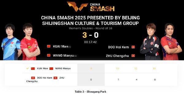 >中国大满贯女双1/8决赛:王曼昱/蒯曼3-0杜凯琹/朱成竹,晋级八强