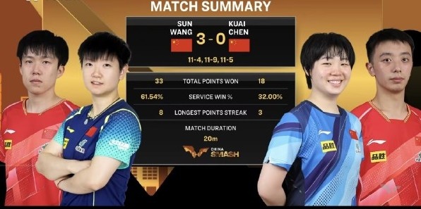 直播吧10月1日讯 2025年WTT中国大满贯混双1/4决赛,王楚钦/孙颖莎以3-0(11-4、11-9、11-5)战胜队友陈垣宇/蒯曼,晋级四强。