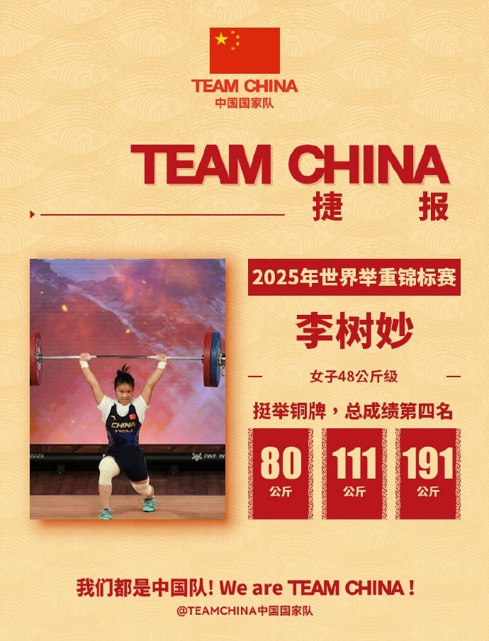 李树妙的挺举铜牌是中国举重队在新级别的首枚世锦赛奖牌。