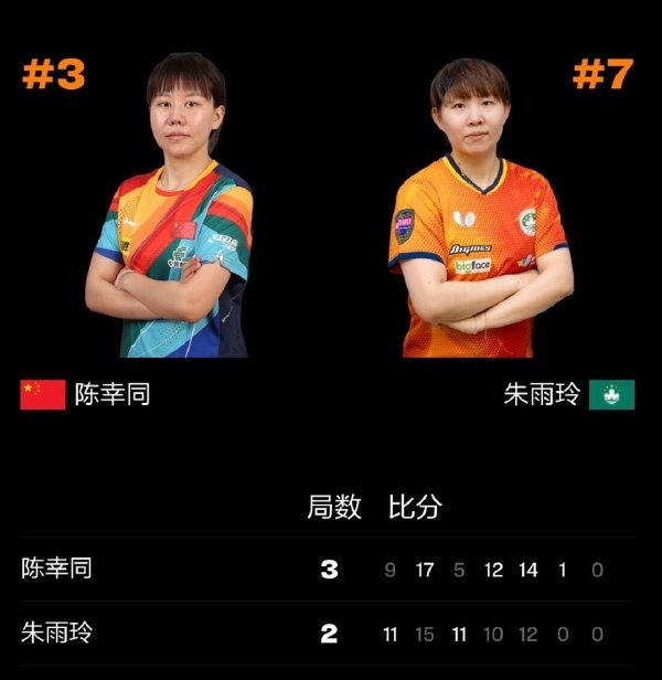 直播吧10月3日讯 2025年WTT中国大满贯女单1/4决赛,陈幸同4-2战胜朱雨玲,晋级女单四强。