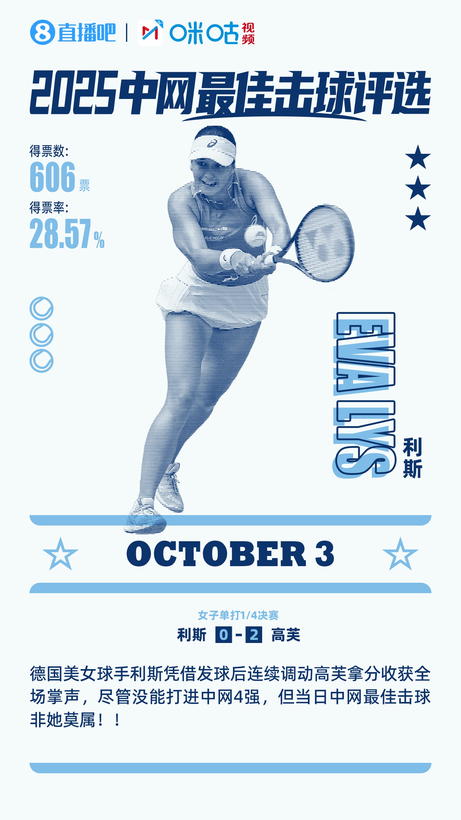 在10月3日的投票中,利斯发球连续调动高芙拿分收获了28.57%的吧友投票,当选当日的#中网最佳击球#。