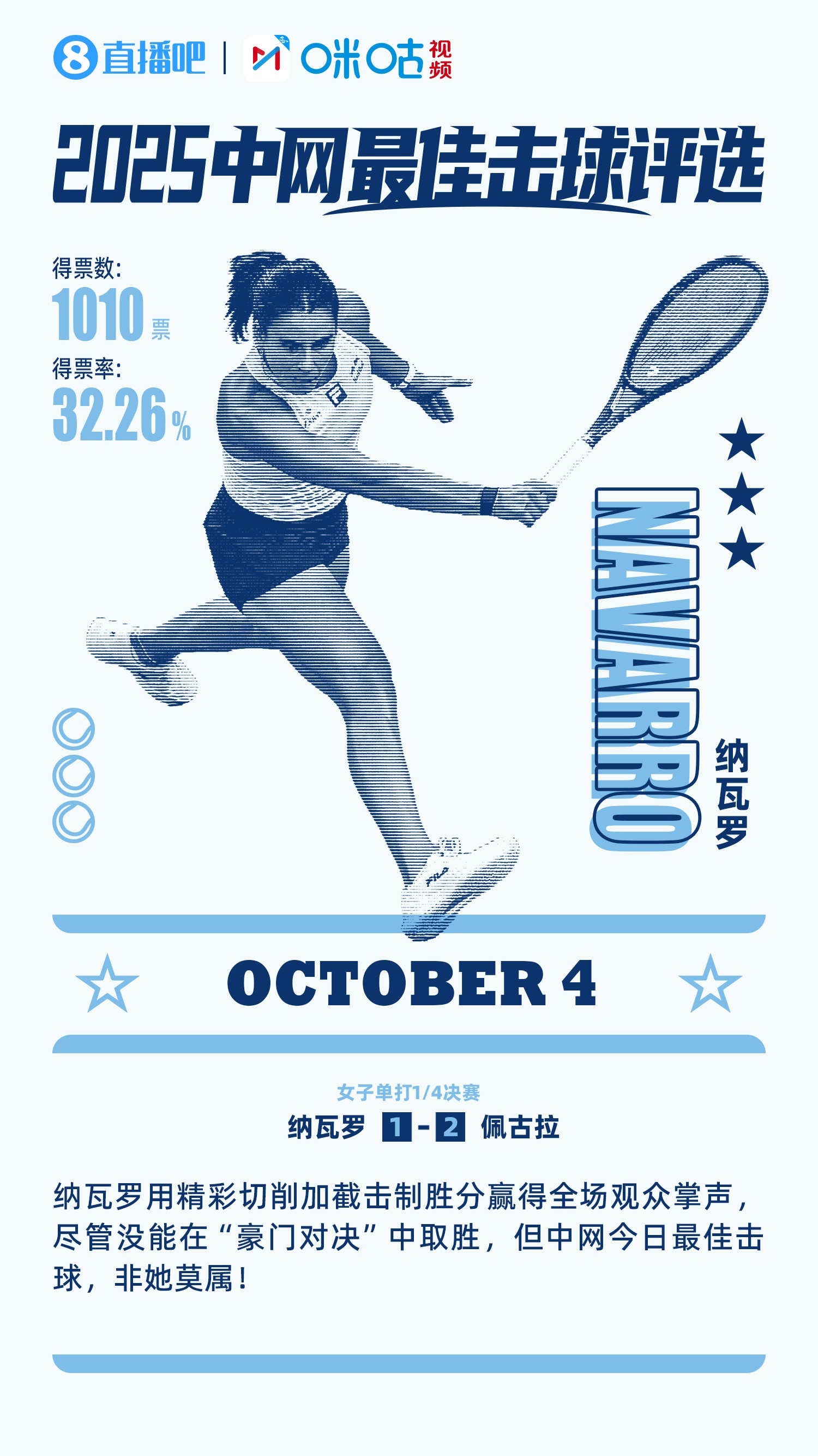 在10月4日的投票中,纳瓦罗精彩切削加截击制胜分获得32.26%的吧友投票,当选当日的#中网最佳击球#!