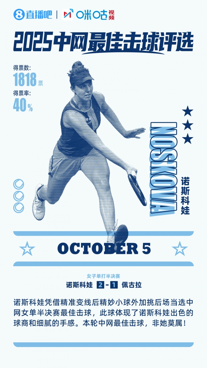 在10月5日的投票中,诺斯科娃凭借精准变线后精妙小球+挑后场得分收获了40%的吧友投票,当选当日的#中网最佳击球#。