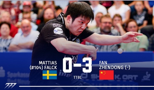 樊振东最终以3-0(11-9, 11-8, 11-6)横扫法尔克,帮助萨尔布吕肯将大比分扳成2-2。