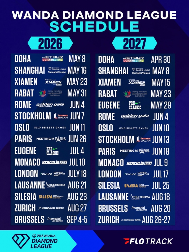 直播吧10月8日讯 田径钻石联赛公布了2026年2027年的赛历,上海和厦门分别为全年的第二站和第三站比赛。