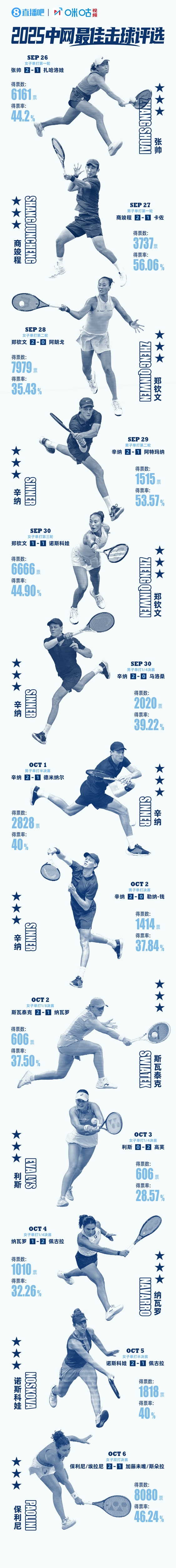 2025年中国网球公开赛已经在北京圆满落幕。阿尼西莫娃夺得中网女单冠军,辛纳夺得中网男单冠军。在中网进行期间,直播吧联合咪咕体育,带来每轮#中网最佳击球#评选活动。