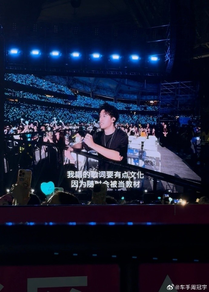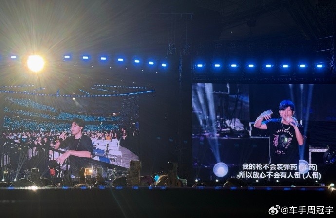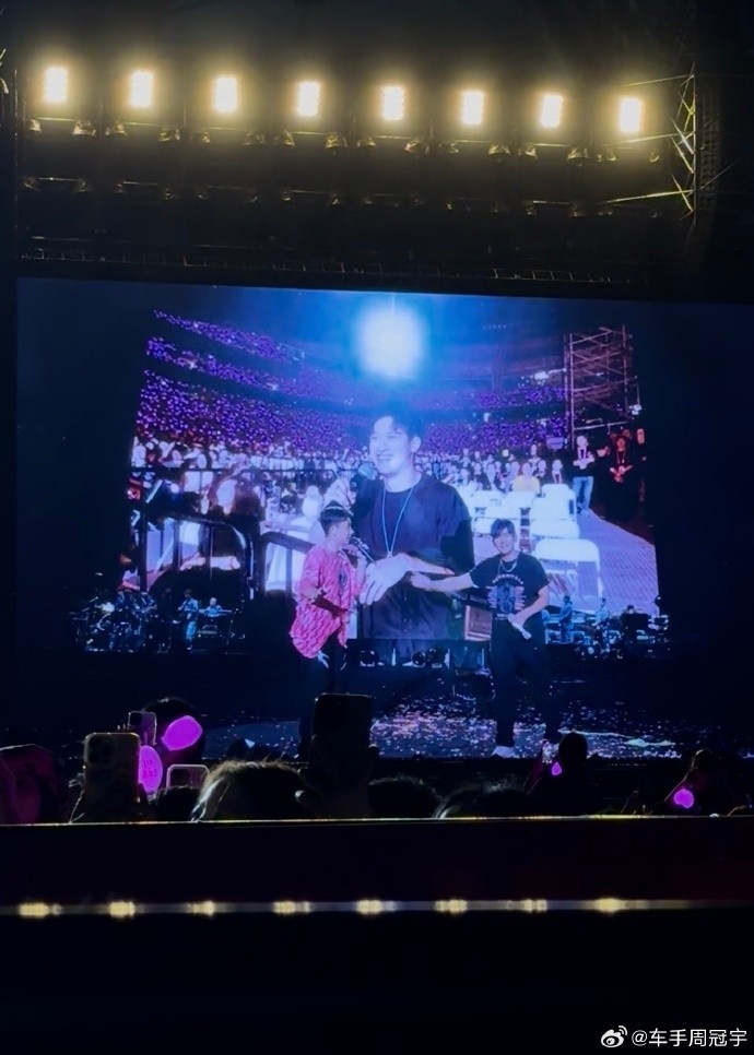 周冠宇在社媒写道:“🎤太太太紧张了!和杰伦哥在演唱会合唱了!(我的耳麦为什么没声音啊啊啊😭) ”