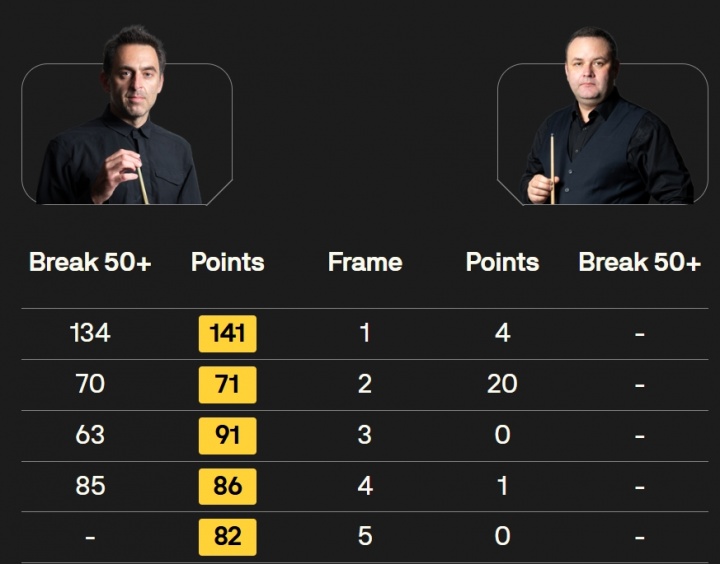 直播吧10月09日讯 斯诺克西安大奖赛第3轮,奥沙利文火力全开,全场比赛打出134、70、63、85分,直落五局5-0零封斯蒂芬·马奎尔,晋级16强,而马奎尔全场比赛仅得25分。