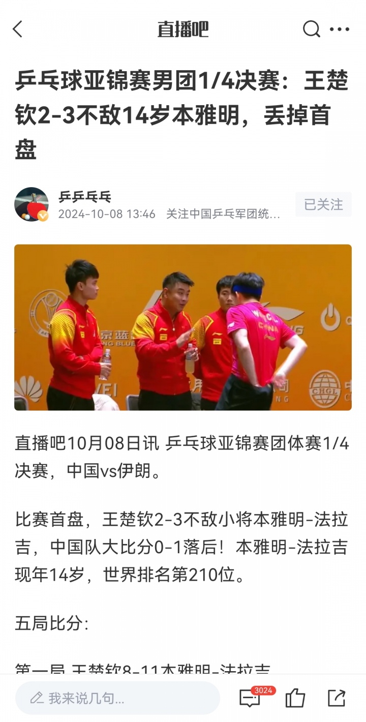 直播吧10月13日讯 亚锦赛男团1/4决赛,中国队对阵伊朗队首场较量,林诗栋2-3不敌15岁小将法拉吉。