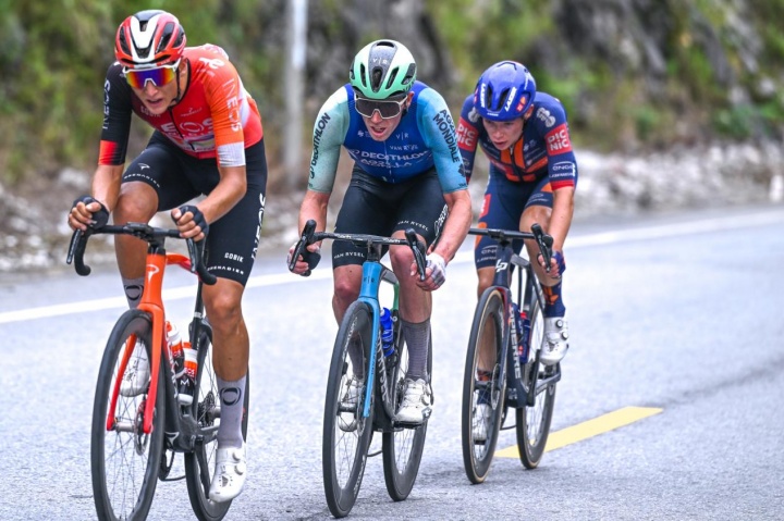 比赛前半程整体海拔变化不大,路况相对平缓,主集团与六人突围小组的时间差始终被控制在1分30秒左右。昨天分获赛段冠亚军的速的奥快步车队和喜德盛-阿斯塔纳车队轮流在集团前方领骑。