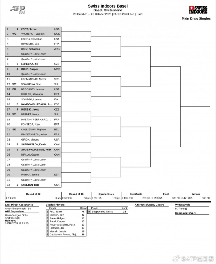 直播吧10月19日讯 ATP官方发布消息更新巴塞尔站签表,因为3号种子鲁内在斯德哥尔摩站比赛中意外受伤,无奈退出ATP500巴塞尔站。
