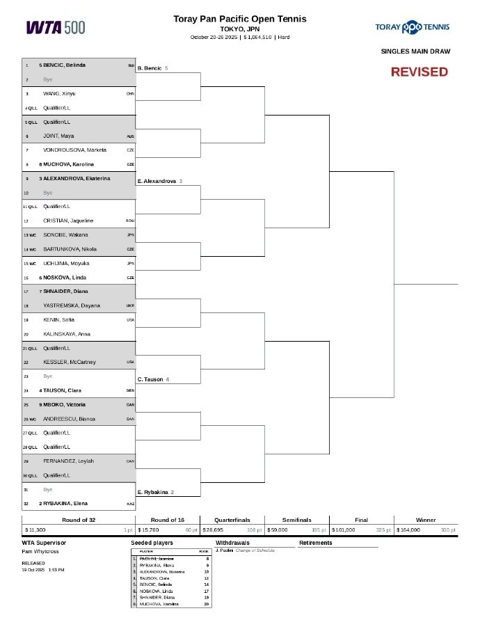 直播吧10月19日讯 WTA官方宣布,因保利尼行程变更退赛,WTA500东京站签表更新。由5号种子本西奇替代保利尼的签位,首轮她将轮空。如果王欣瑜首轮击败资格赛选手,将在次轮对阵本西奇。