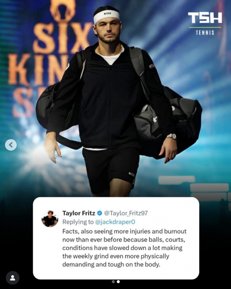 美国网球运动员泰勒-弗里茨表示:“事实上,现在受伤和倦怠的情况比以前任何时候都多,因为球、球场和条件都已经变慢了很多,使得每周的训练对身体的要求更高、更辛苦。”