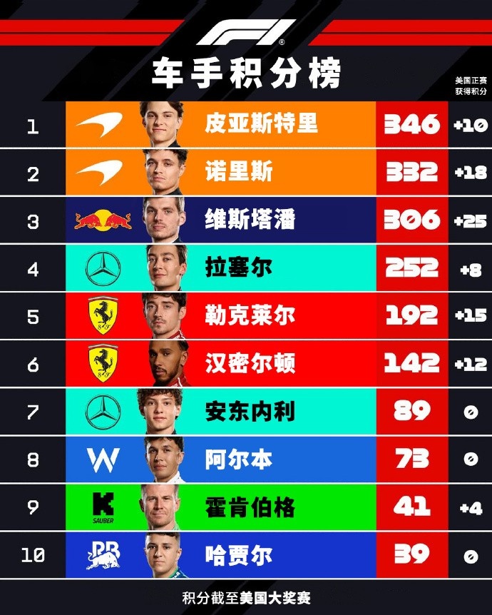 直播吧10月20日讯 F1美国大奖赛正赛结束争夺,维斯塔潘杆位发车夺冠,诺里斯第二,皮亚斯特里第五。车手积分榜上,维斯塔潘凭借本站拿到的33分将与皮亚斯特里的差距缩小至40分,本赛季F1还剩下5场大奖赛,包括2场冲刺赛。