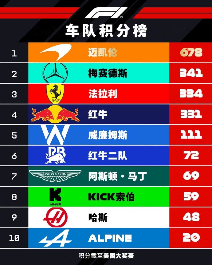 直播吧10月20日讯 F1美国大奖赛结束,最新车队积分榜上,迈凯伦已经提前夺冠,梅赛德斯、法拉利以及红牛三支车队争夺年度积分榜第二的位置。