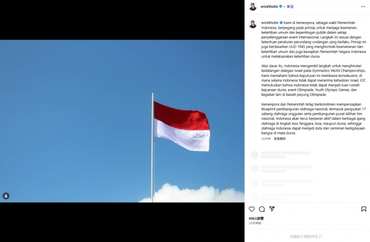 印尼体育部长托希尔今日发文:作为印尼政府的代表,体育部门始终秉持维护安全、公共秩序和公众利益的原则,确保所有国际赛事顺利举办。此举符合相关法律法规。该原则也基于1945年宪法,该宪法尊重安全、公共秩序,也体现了印尼政府维护国际秩序的义务。