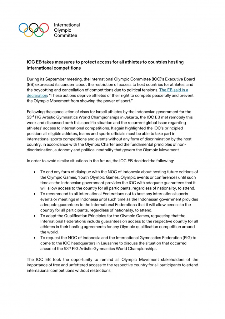 1. 终止与印度尼西亚奥委会关于未来举办奥运会、青奥会、奥运赛事或会议的任何对话,直到印度尼西亚政府向国际奥委会提供充分保证,允许所有参与者无论国籍如何,都能进入该国。