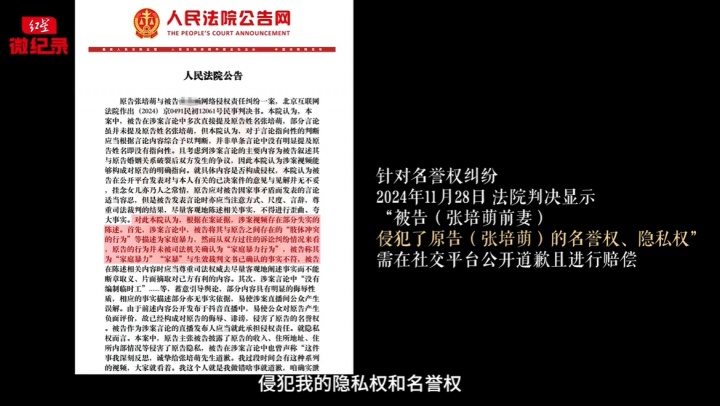 张培萌:“第一个判决结果就是我没有家暴,没有出轨。前妻天天在网上大量时间直播攻击我,侵犯我的隐私权和名誉权。(关于名誉权)判决就是张漠寒要向我道歉,并且赔偿我精神损失费。