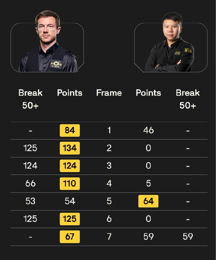 利索夫斯基全场打出三杆破百(125、124、125)和两杆50+(66、53),以6-1的比分战胜周跃龙晋级决赛。