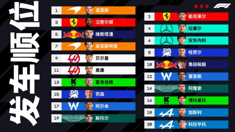 安东内利第六,塞恩斯第七,但因上站被罚退五位,将从第12位发车。积分领跑者皮亚斯特里递补第七,哈贾尔、贝尔曼、角田裕毅将从第八至第十发车。