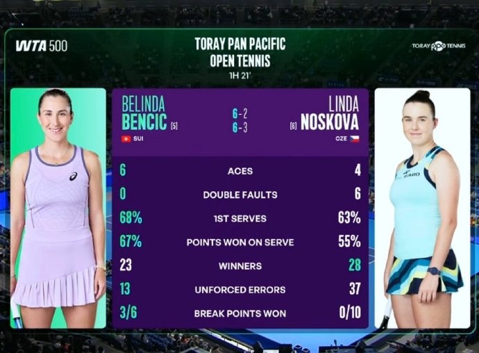 直播吧10月26日讯 WTA500东京站决赛,5号种子本西奇以6-2 6-3完胜6号种子诺斯科娃,夺得冠军!