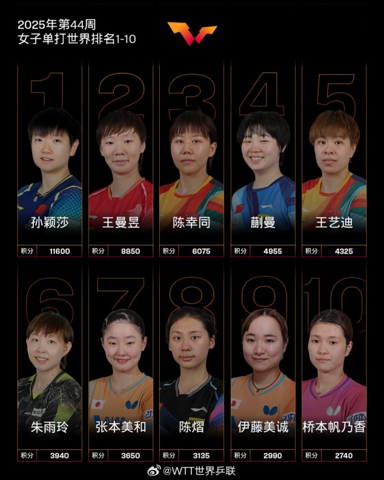 直播吧10月28日讯 WTT公布了最新一期世界排名,女单方面国乒选手孙颖莎、王曼昱、陈幸同、蒯曼和王艺迪包揽前五位,中国澳门选手朱雨玲排第6,陈熠第8。