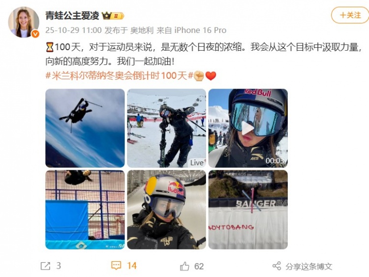 谷爱凌写道:100天,对于运动员来说,是无数个日夜的浓缩。我会从这个目标中汲取力量, 向新的高度努力。我们一起加油!