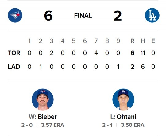 本场比赛为道奇先发投球的大谷翔平6局被敲出6支安打丢4分,此外有6次三振,吞下败投。打击方面也陷入疲软,4个打席没有安打,选到1次保送还有2次被三振。