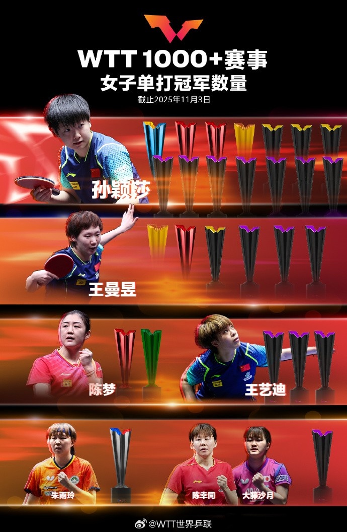 女单方面孙颖莎14次夺冠居首,王曼昱6次随后,王艺迪3次夺冠反超陈梦排名第三。