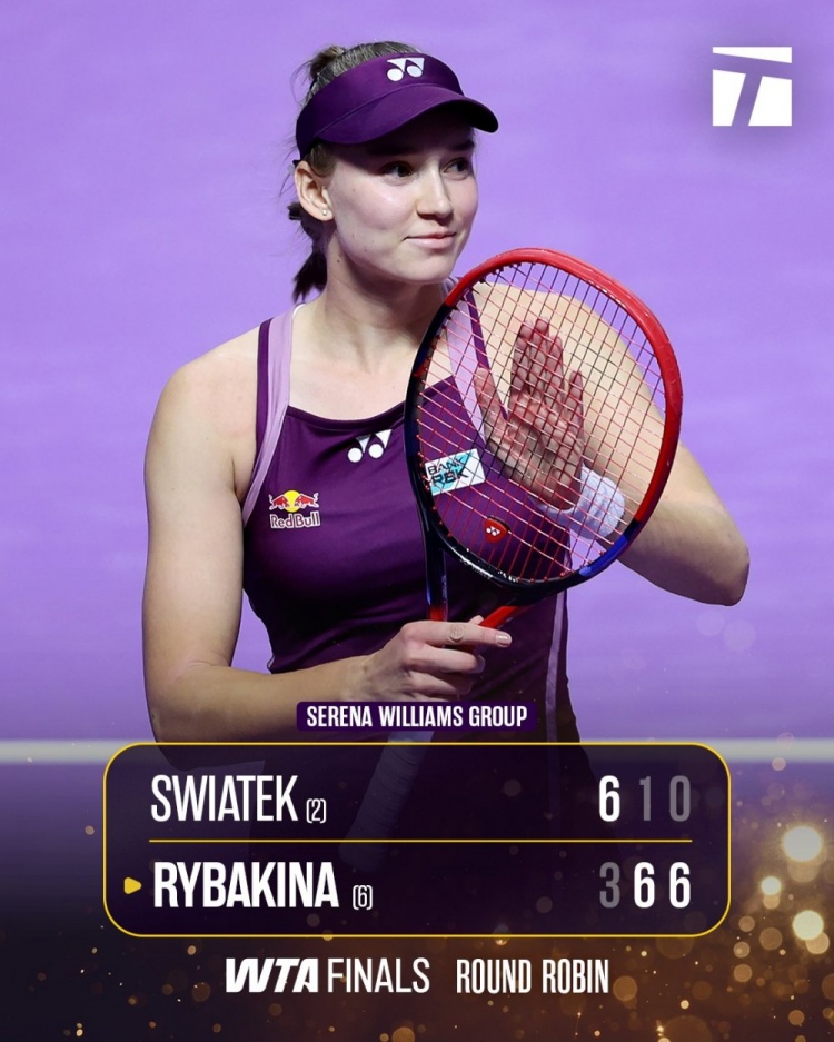 直播吧11月4日讯 利雅得WTA年终总决赛单打小威廉姆斯组焦点战,莱巴金娜2-1送蛋逆转斯瓦泰克。