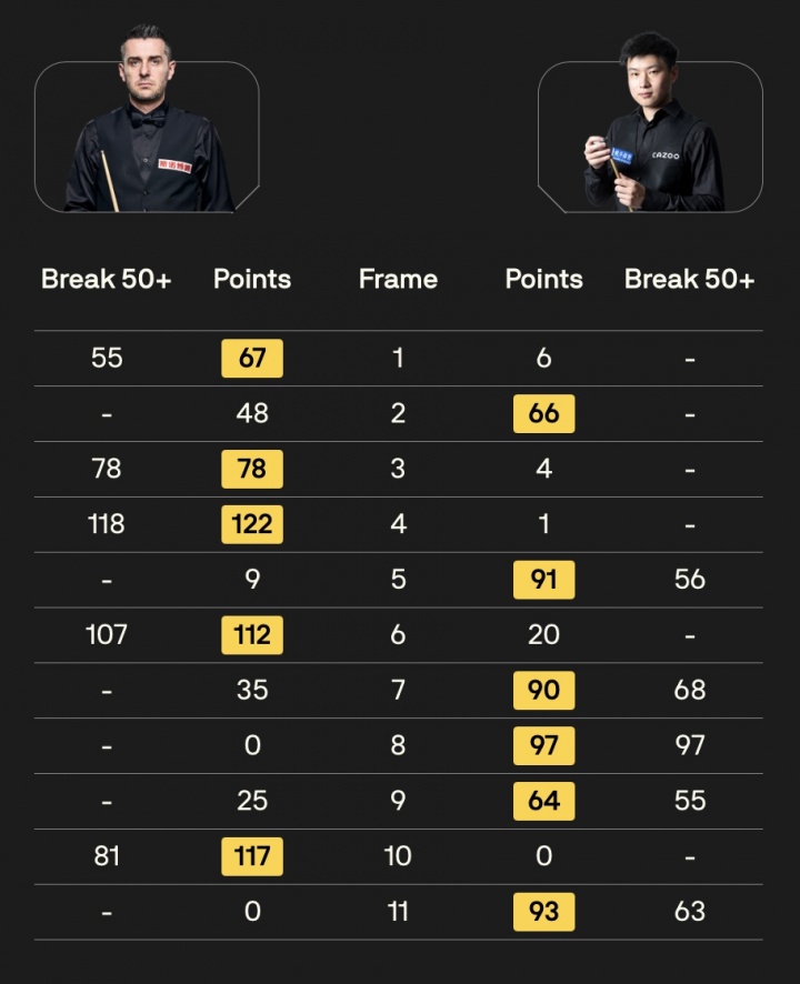 塞尔比一度取得4-2领先,赵心童打出单杆68、97、55分连胜三局取得赛点,第十局塞尔比打出单杆81分并完成高难度清台获胜,决胜局中赵心童抓住机会打出63分并制胜。