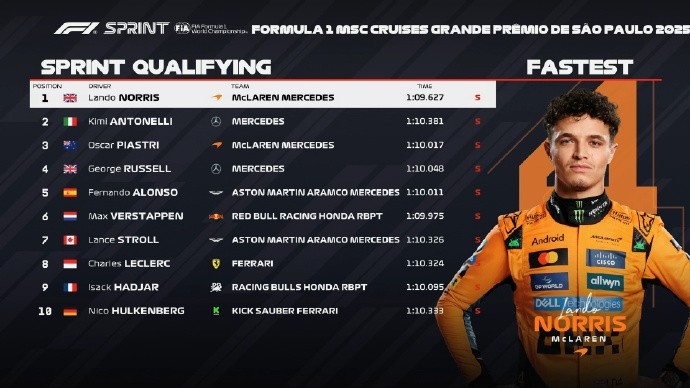 直播吧11月8日讯 2025F1圣保罗大奖赛冲刺赛排位赛,诺里斯1:09.627夺得冲刺赛杆位,头排发车的还有安东内利1:10.381排第二,同样在头排发车。皮亚斯特里和拉塞尔在第二排。两辆阿斯顿·马丁排在第五和第七,维斯塔潘第六。勒克莱尔、哈贾尔和霍肯伯格排在第八到第十位。