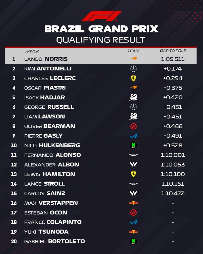 直播吧11月9日讯 F1圣保罗大奖赛排位赛结束争夺,诺里斯夺得杆位,安东内利第二,维斯塔潘Q1出局。