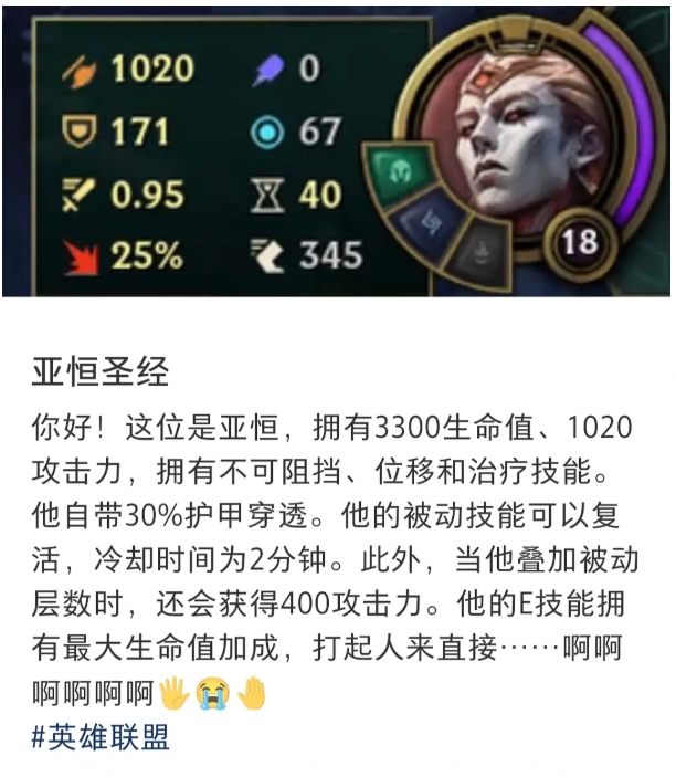直播吧11月11日讯 近日,英雄联盟公布了新英雄亚恒,而不少玩家也测试服进行体验,然而今日有玩家发现新英雄的机制和数值强的可怕!