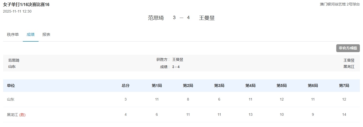 本场比分范思琦6-11,11-8,11-6,13-11,10-12,9-11,14-12王曼昱。王曼昱下一轮将对阵钱天一和关卓琳之间的胜者。