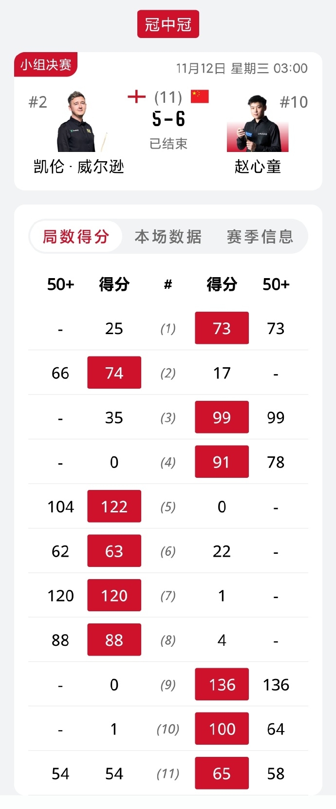 直播吧11月12日讯 2025斯诺克冠中冠小组赛决赛,全场比赛赵心童打出一杆破百(136)和五杆50+(73、99、78、64、58),凯伦·威尔逊打出两杆破百(104、120)和四杆50+(66、62、88、54)。