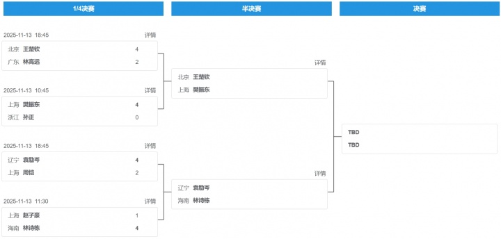 半决赛另一组对决是林诗栋(海南队)vs袁励岑(辽宁队)。