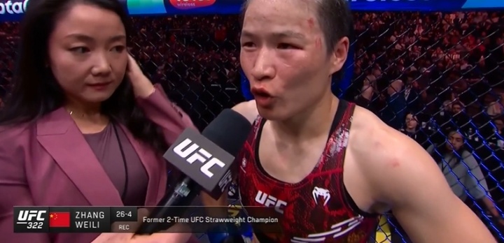 直播吧11月16日讯 UFC女子世纪战,张伟丽升重不敌舍甫琴科,无缘夺蝇量级冠军。赛后张伟丽接受了采访。