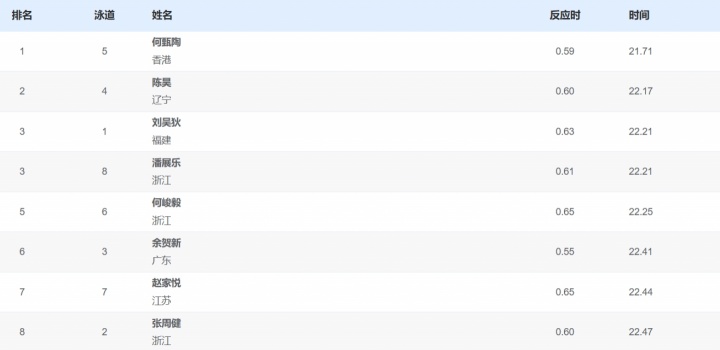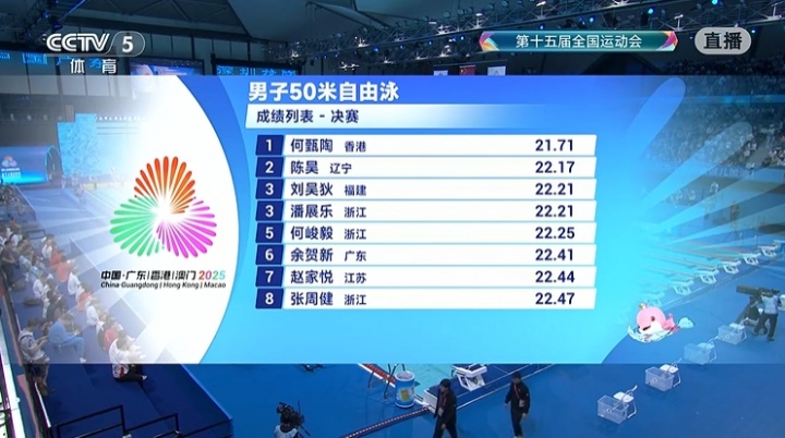 全运会男子50米自由泳决赛:何甄陶21秒71夺金 潘展乐22秒21摘铜