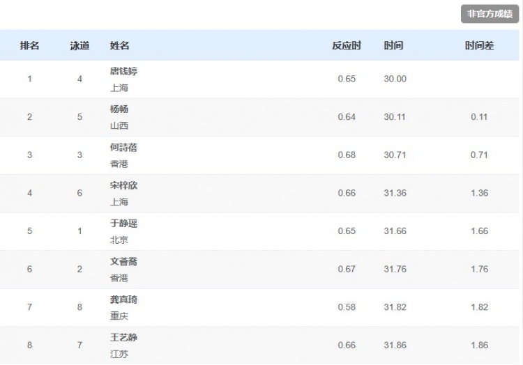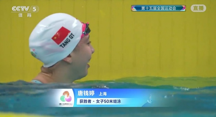 直播吧11月17日讯 全运会游泳女子50米蛙泳决赛,唐钱婷以30秒00夺得金牌,杨畅获得亚军,何诗蓓获得季军。