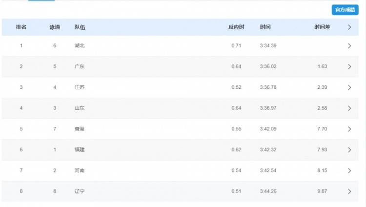 直播吧11月17日讯 全运会男子4×100米混合泳接力决赛:湖北队以3分34秒49的成绩夺得冠军,广东收获亚军,江苏收获季军。
