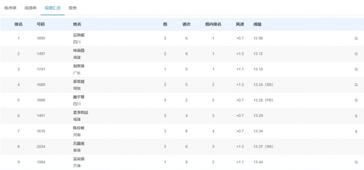 吴艳妮总成绩同样排名第一,预赛19名选手中仅她一人跑进13秒。