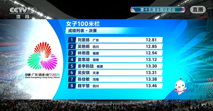 决赛中三人贡献了精彩发挥,跑进了13秒大关,刘景扬12秒81,吴艳妮12秒85,林雨薇12秒94。吴艳妮、林雨薇、夏思凝都创造了个人赛季最好成绩,刘景扬更是刷新了个人历史最好成绩。
