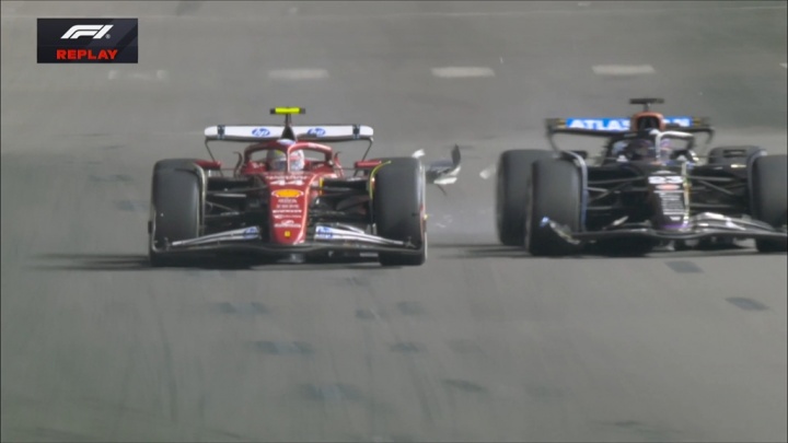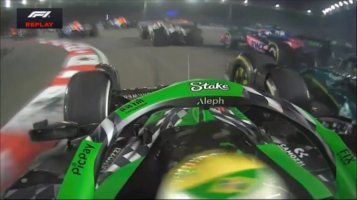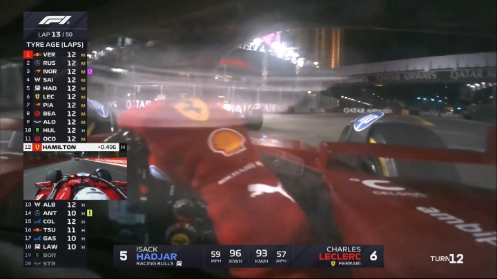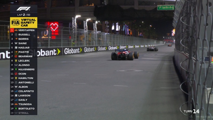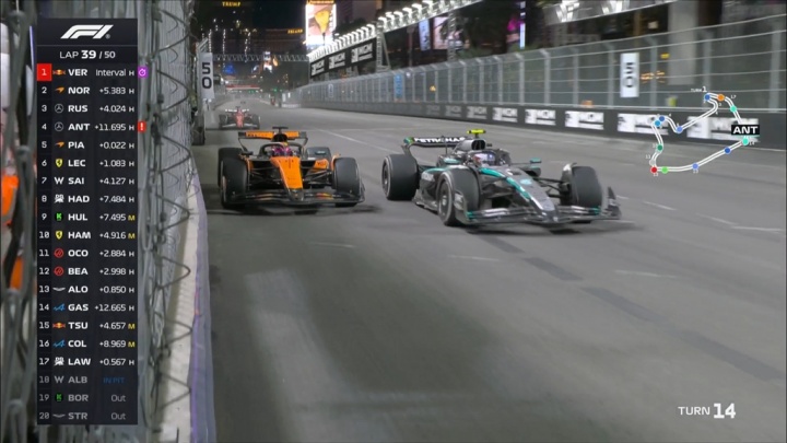 1/50:戏剧性发车,诺里斯进入一号弯时冲出赛道,维斯塔潘领跑,拉塞尔升到第二。劳森因1号弯与皮亚斯特里的碰撞前翼受损,虚拟安全车出动。