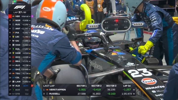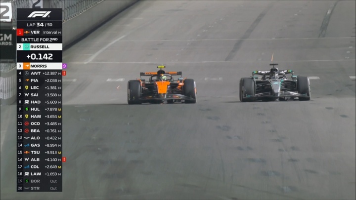 34/50,诺里斯利用DRS在16号弯前的直道上超越拉塞尔,车队此前告诉他目标是追上维斯塔潘。