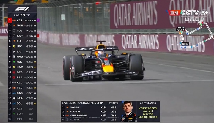 48/50:诺里斯一圈掉了2.3秒,维斯塔潘领先优势10秒。最终,维斯塔潘夺冠!